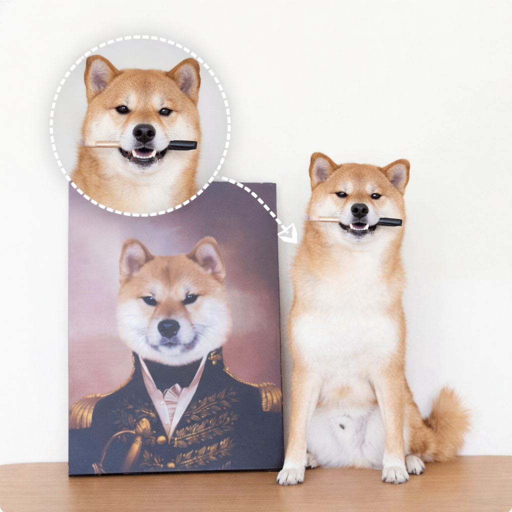 The General Haustierporträt ist ein einzigartiges Kunstwerk, das das Charisma und die Loyalität deines Haustieres stilvoll in Szene setzt. Inspiriert von klassischen viktorianischen Porträts verwandeln wir dein Haustierfoto in ein edles Generalgemälde voller Würde und Ausdruck – als besondere Hommage an die tiefe Verbindung zwischen dir und deinem Liebling.